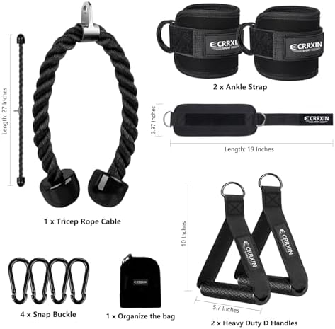 - Complete Kit & Reliable Support: Your package includes: 35-inch Tricep Rope, Resistance Band Handle, Ankle Straps, Storage Bag, 4 Carabiners, The included storage bag ensures easy portability.Backed by our 24-hour customer service, we guarantee a swift response to any concerns for complete satisfaction.