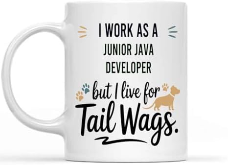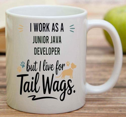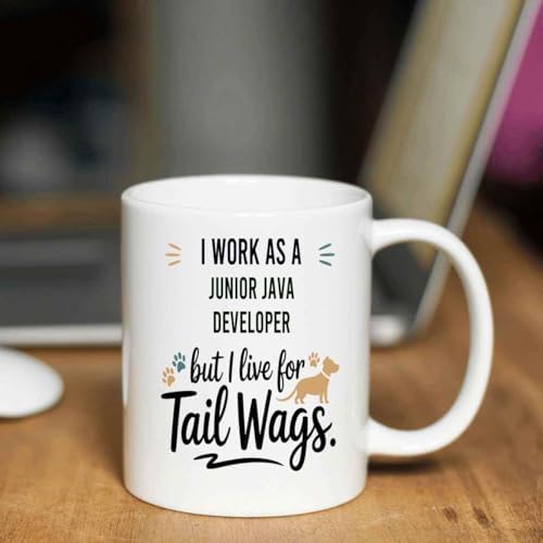 Gift Design Funny Gift for a Junior Java Developer, Pet Lovers, I Work As a Junior Java Developer, But I Live for Tail Wags 11 Oz White Ceramic Coffee Mug