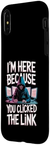 • Hilarious hacker-themed design with a hooded figure and bold meme phrase “I’m Here Because You Clicked The Link” in digital-style typography.
