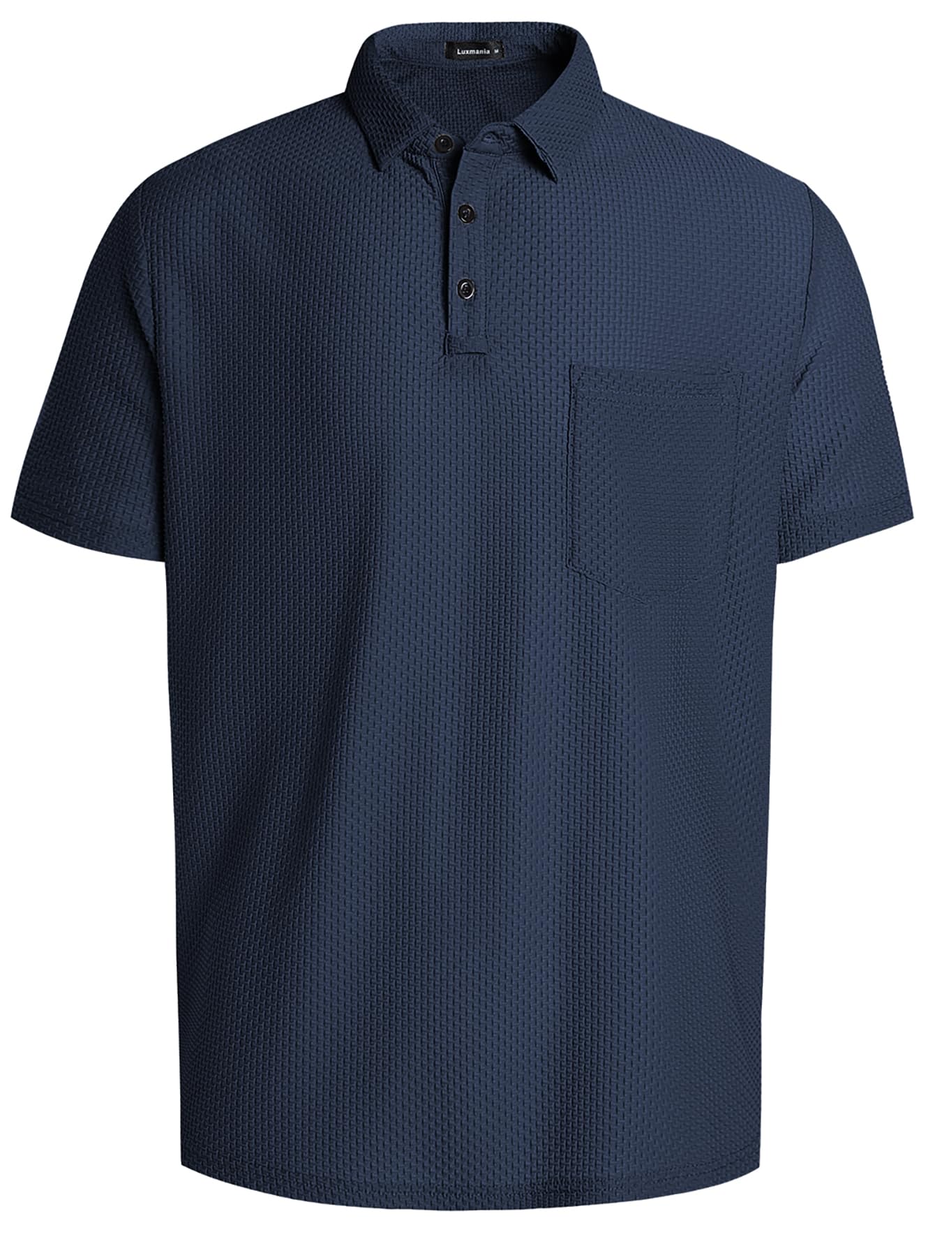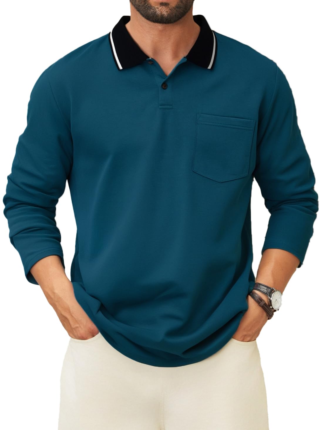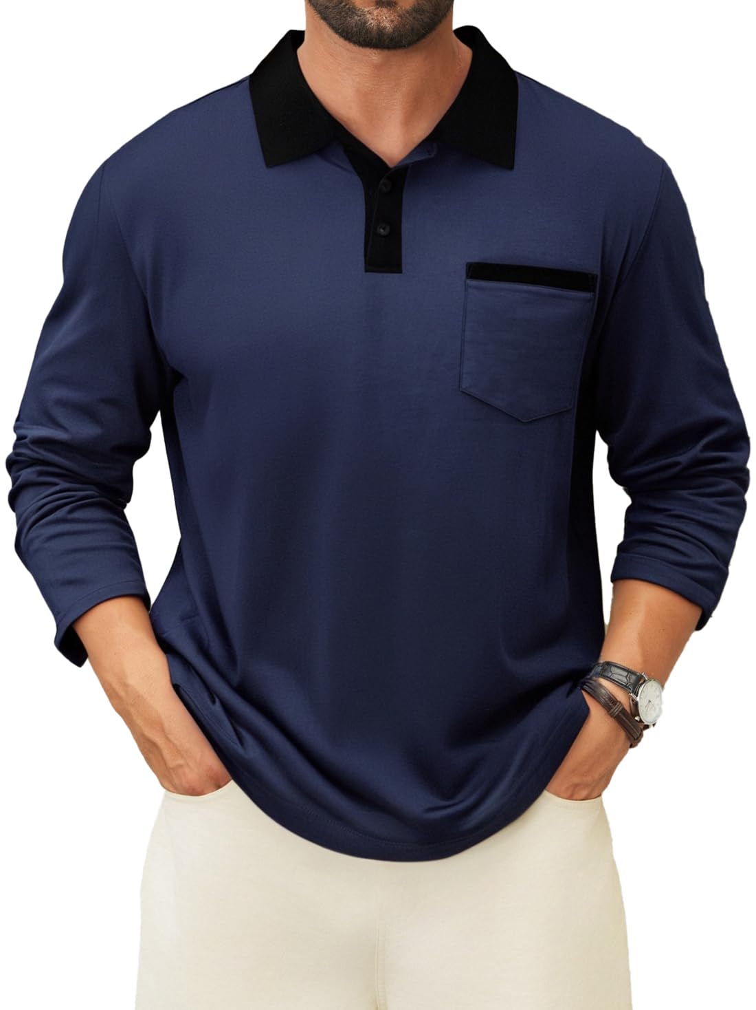 Men's Casual Long Sleeve Polo Shirts Cotton Polos T Shirt Classic Button Collared Golf Shirt with Pocket Navy M