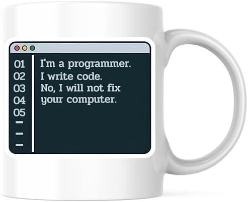 Fuel your coding sessions with a dose of humor with this unique ceramic coffee mug. The design features a playful quote that resonates with programmers and developers. This mug is more than just a beverage holder; it is a conversation starter and a fun way to express your love for coding. Designed to be both eye catching and functional, this 11 ounce mug is suitable for your coffee, tea, or any favorite drink. Its smooth, comfortable handle and durable construction make it ideal for everyday use. The design is printed on both sides, ensuring it is visible no matter which hand you use. This mug is a great way to add a touch of personality to your desk or kitchen. It brings a lighthearted vibe to your daily routine, whether you are at home or in the office. Cleaning is also simple because this mug is both microwave and dishwasher safe.