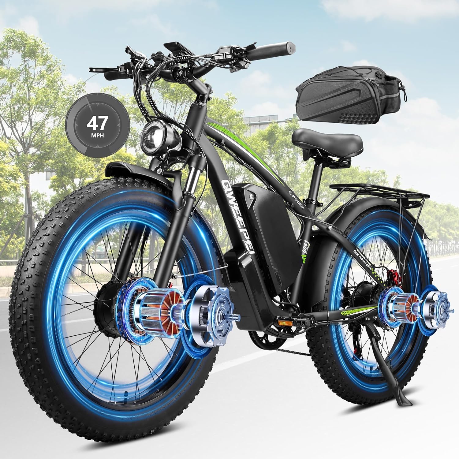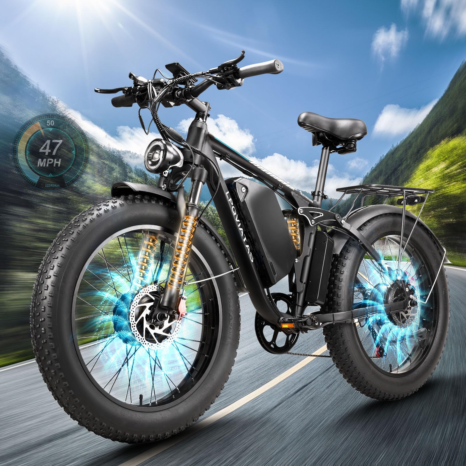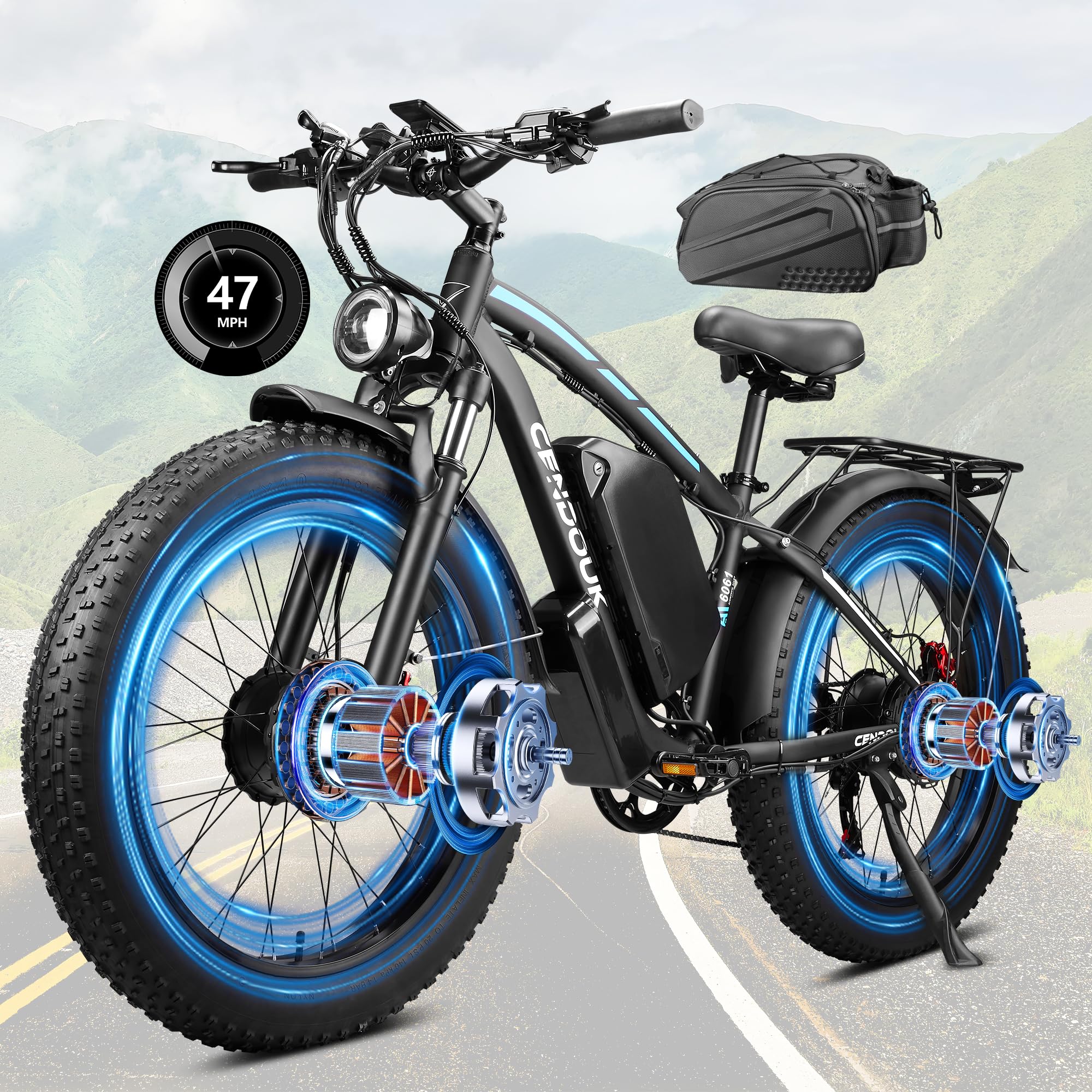 - 【Dual Motor Ebike Unleash Thrilling Speed & Power】Experience heart-pounding acceleration with dual 3000W peak brushless motors delivering 6000W combined output. Conquer 40° inclines effortlessly with 200N·m torque, reaching speeds in 45MPH in PAS Level 5 mode - perfect for adrenaline-fueled adventures or swift urban commutes. Our smart torque algorithm ensures seamless power delivery across all terrains
