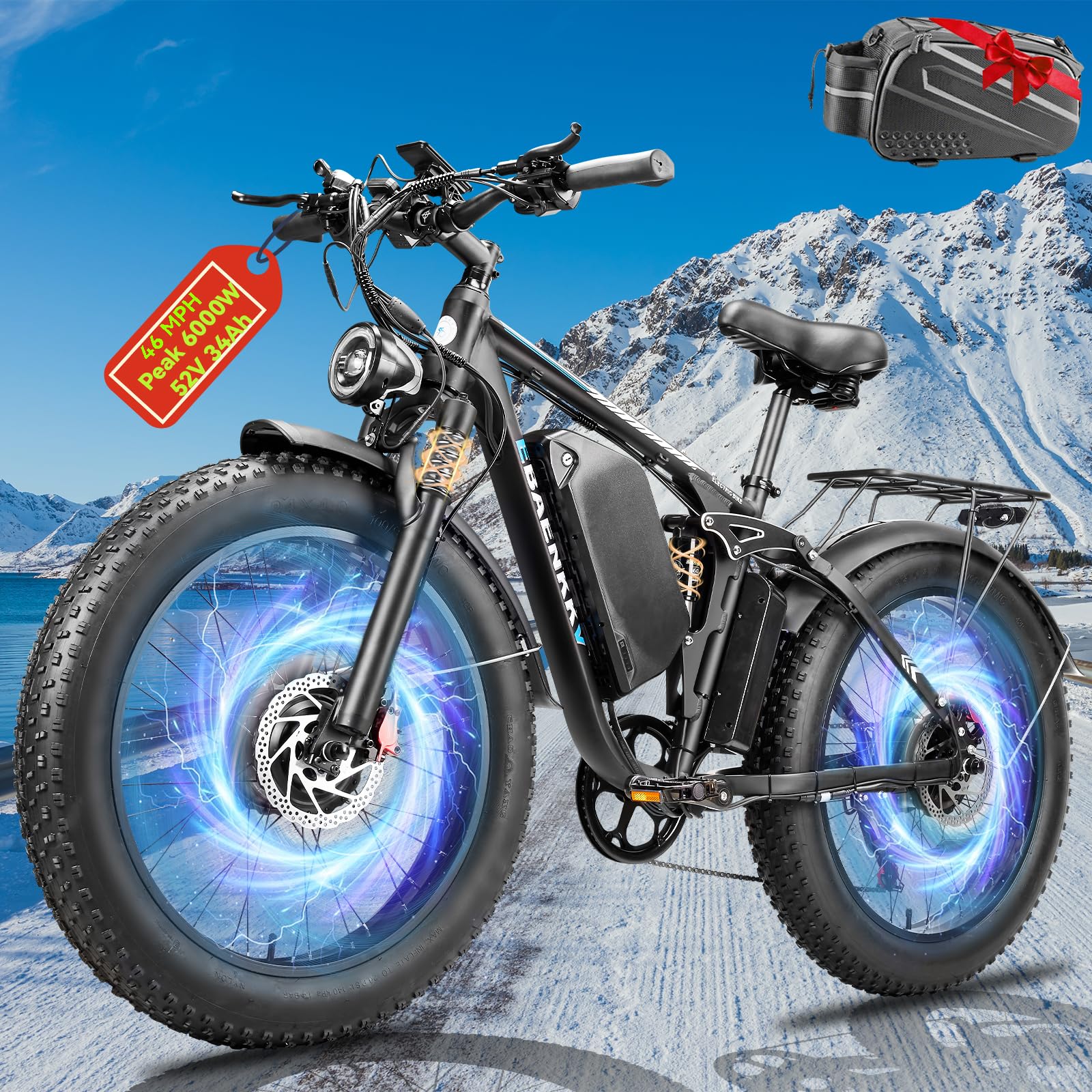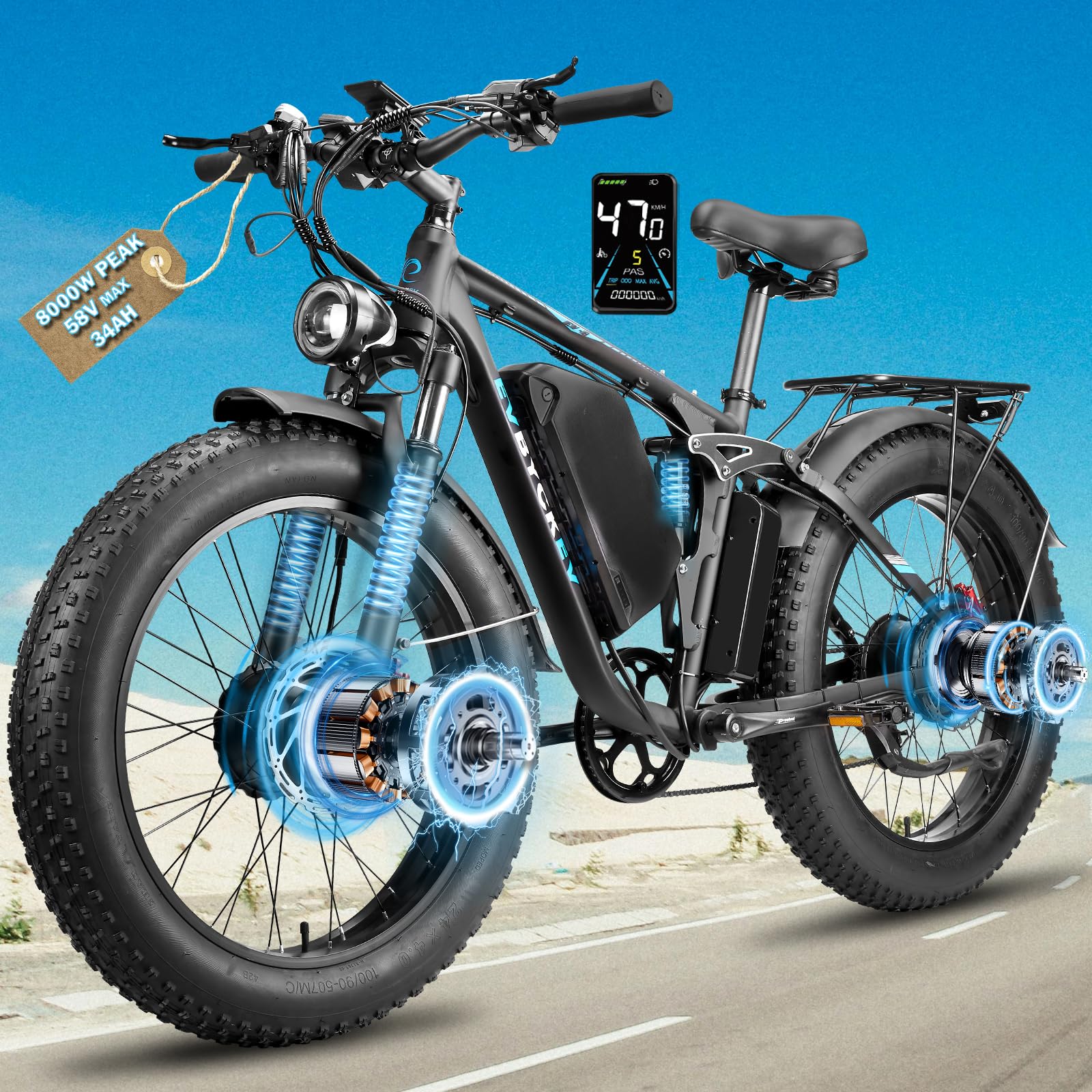 6000W Peak Dual Motor Ebike for Adults - 52V 34Ah Fast Electric Bike for Men Women 45 MPH,Up to 100 Miles,24" Fat Tire Lockable Suspension Electric Bicycle for Snow Off-Road Commuter Mountain E-Bike