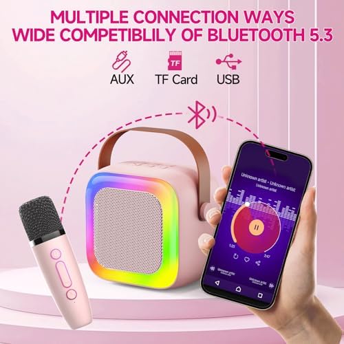Mini Karaoke Machine for Kids Teen Adults, Kids Karaoke Machine with 2 Wireless Microphones and LED Lights Toys for Party, Home, Gifts for 4 5 6 7 8 9 10 11 12+ Years Girls Boys(Pink)