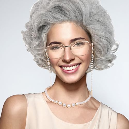 - Grandma's Costume: Our grey wigs are crafted from 100% synthetic fibers, offering exceptional breathability and ensuring a comfortable fit. The wig cap is also constructed from synthetic fibers, which helps maintain the wig's neatness and stability during wear. Additionally, the glasses, glasses chains and imitation pearl necklaces are all made from lightweight plastic materials