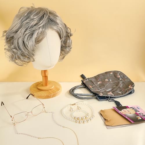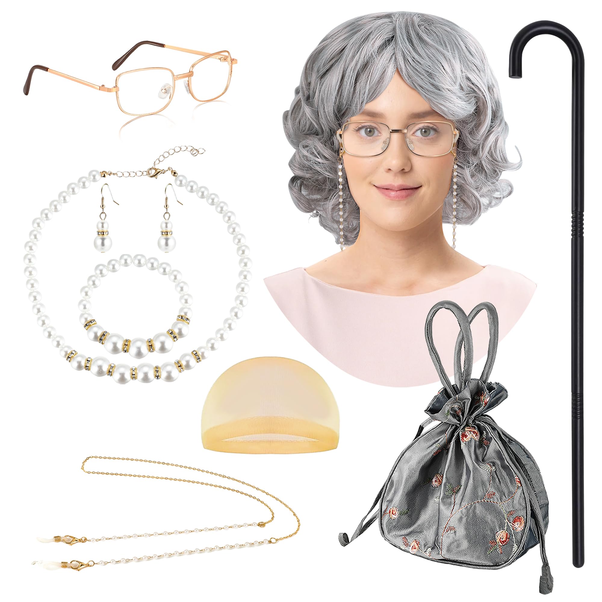 - Old Lady Costume: Includes everything needed for the old lady costume: 1pc old lady grey wig + 1pc pearl necklace + 1pc eyeglasses chain + 1pc granny glasses + 1pc wig cap + 1pc walking stick + 2pcs earrings + 1pc simple bag + 1pc bracelet. Our old lady costume is comfortable to wear and easily meets your dressing needs