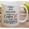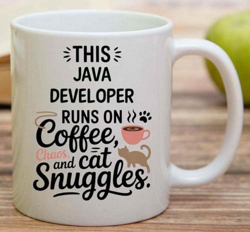 Gift Design Idea Funny Gift for Java Developer, Pet Lovers. this Java Developer Runs on Coffee, Chaos, and Cat Snuggles 11 Oz White Ceramic Coffee Mug