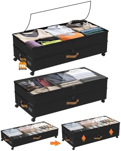 - 【75L Larger Capacity & Space-Saving】Maximize your storage with our Under Bed Storage with Wheels! This XXL under-bed storage bin offers a massive 75L capacity, perfect for stashing clothes, shoes, blankets, and more. It features adjustable height (8.4in~12in) to fit different bed frames, sliding effortlessly under most spaces to free up precious room in bedrooms and dorms.
