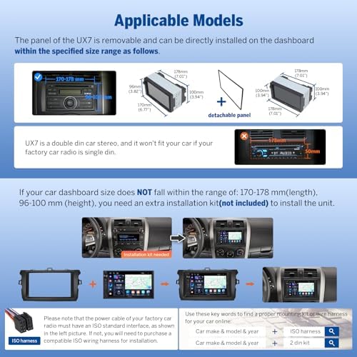 - 🔸【Applicable】: The UX7 features a 7-inch adjustable panel that supports vertical movement and allows angle adjustments in all directions, ensuring optimal viewing and seamless dashboard integration. If your original car radios mounting size compatible with: Width from 170-178 mm (6.69 inches-7.01 inches), height from 96 mm-100 mm (3.78 inches-3.94 inches), all sizes in this range can be installed and have an ISO power cord, you can directly install it. If the installation dimensions of your car's center console do not match the dimensions you must need to BUY EXTRA accessories to install it.