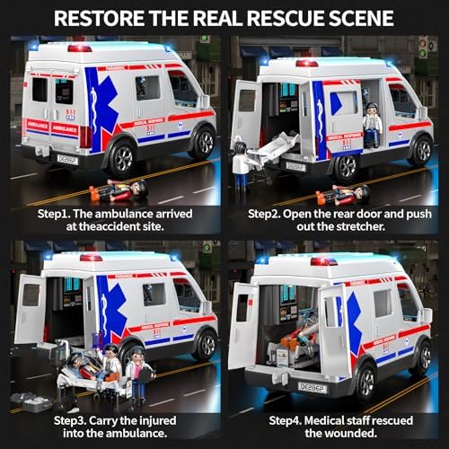 • 🚑️【Realistic Details】The meticulous details of the ambulance toy car make it look like a real emergency vehicle. Open the roof and put in 3*AAA batteries (not included), and press the button on the roof to turn on the sound and lights. Press the ECG monitor in the car to make a beeping sound. All five doors can be opened and closed, the steering wheel can be rotated, and the wheels of the ambulance stretcher can be folded and slid into the cabin.