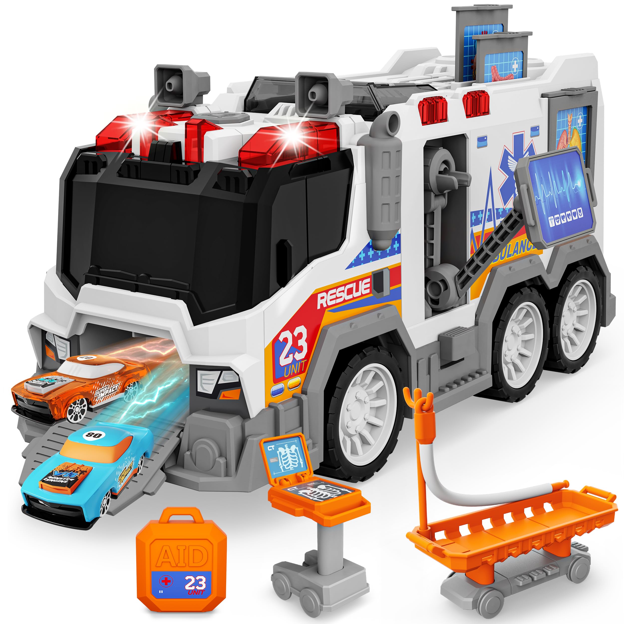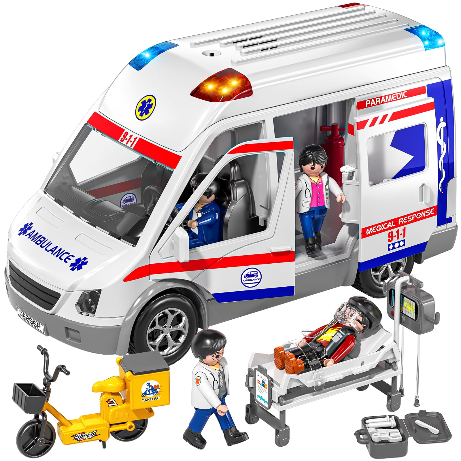 • 🚑️【Upgraded Style-Simulated Ambulance】The ambulance toy contains 1* ambulance, 3* action figures, 1* stretcher accessories, 1* infusion tube accessories, 1* medical accessories, 1* sticker and 1* instruction manual. Flashing lights and realistic sirens create a realistic effect. A perfect toy that can stimulate children's imagination, it is very suitable for kids aged 3, 4, 5, 6, 7, 8, 9 years old.