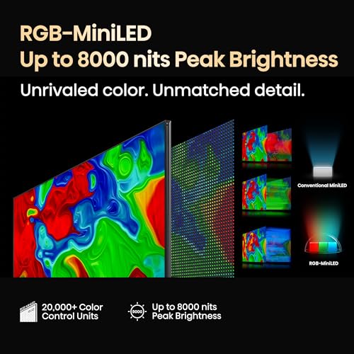 - RGB-MiniLED | Up to 8000 nits Peak Brightness | 20000+ Color Control Units: Take your Mini-LED up a level with the RGB-MiniLED. The RGB Local Dimming technology is the first of its kind and replaces standard blue and white LEDs with red, green, and blue ones for the most realistic color. Experience ultra-sharp contrast and purest hues with peak brightness reaching up to 8,000 nits.