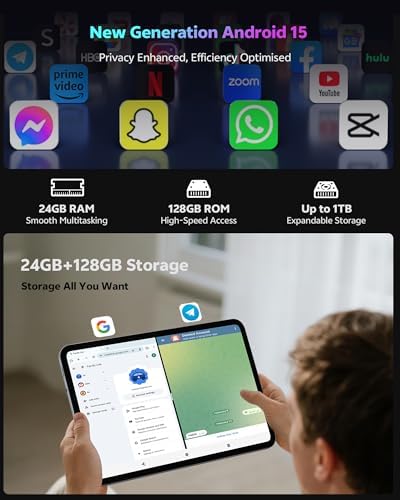 - 【Latest Android 15 + 24GB RAM + 128GB ROM】Equipped with the latest Android 15 operating system and an optimised interface, it supports privacy protection, split-screen collaboration. The optimized algorithm improves compatibility, allowing most apps to run smoothly. With 24 GB of ultra-large RAM (6 GB + 18 GB), it can handle multiple applications with ease, meeting the demands of heavy gaming and office work. With 128GB of expandable storage, you can keep roughly 100,000 full-size photos on it.