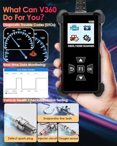 - USER-FRIENDLY DESIGN FOR EVERY DRIVER: Effortlessly diagnose your car's issues! The V360 is designed with simplicity in mind, featuring an intuitive interface perfect for beginners and experts. Quickly read & clear check engine lights (MIL), view fault codes, reset monitors, and understand your vehicle's health without confusion.
