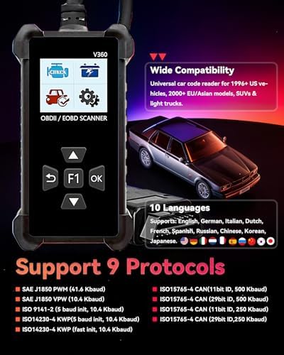 - UNIVERSAL COMPATIBILITY & MULTI-LANGUAGE SUPPORT: Works flawlessly with virtually ALL gasoline cars, trucks, SUVs, hybrids & minivans worldwide sold after 1996 (OBDII/EOBD compliant). Supports ALL major protocols (CAN, KWP2000, ISO9141, J1850 VPW/PWM). Menu displays in 10 languages (English, German, Italian, Dutch, French, Spanish, Russian, Chinese, Korean, Japanese).