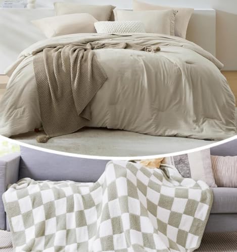 WRENSONGE King Size Comforter Set, 7 Pieces Soft Light Oatmeal Bed in a Bag King with Fitted Sheet, Flat Sheet, 2 Pillow Shams, and 2 Pillowcases- Warm Bedding Set for All Season WRENSONGE Checkered Throw Blanket, Sage Green Soft Cozy Fluffy Hand Made Throw Blankets for Couch, Sofa, Chair, Bed, Camping, Picnic, Travel Lightweight Bed Blankets for Women Mothers Birthday Gifts