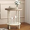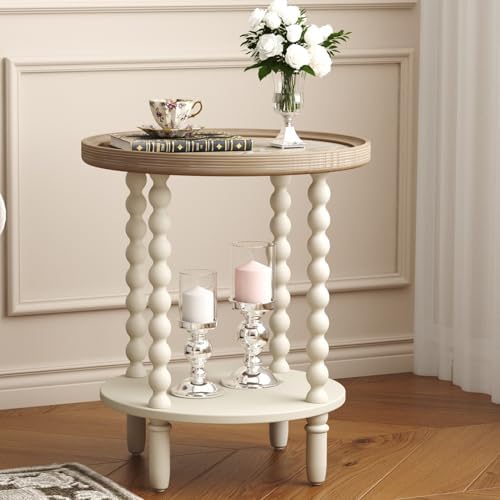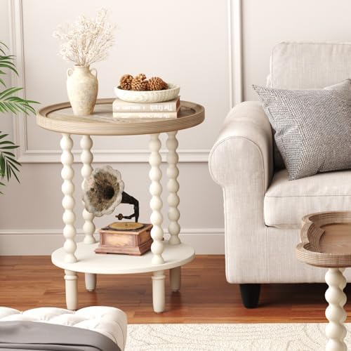 Function Home Round End Table, Rustic Farmhouse Side Table with Storage Shelf, 2-Tier French Country Nightstand for Living Room Bedroom Small Space, Natural Tray Top and Vintage White Spindle Legs