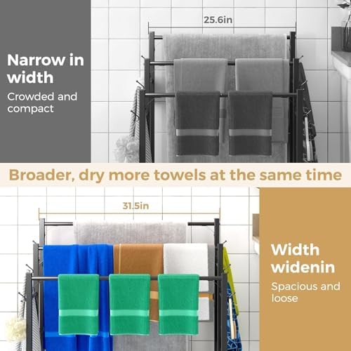 - 【Designed for oversized towels】 This bathroom towel rack is specially designed to hold oversized bath towels, the front and rear towel bars are 6.29 inches apart, and spacious ventilation helps to quickly dry multiple towels, keeping them clean and off the floor, with 3 hooks on each side for hanging bath sponges and small items.