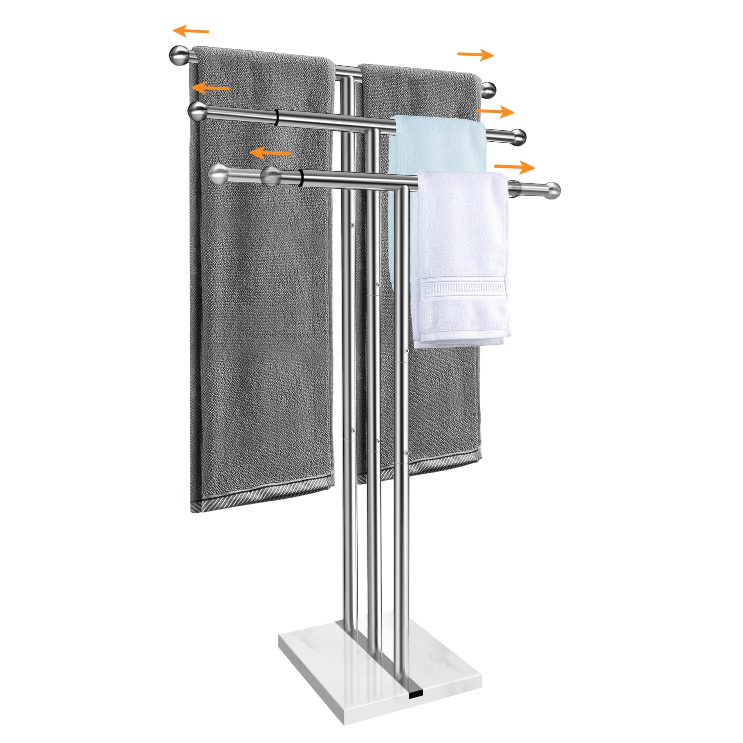 - 【Durable Metal Construction】 Made from quality metal with a matte black powder-coated finish, this freestanding towel rack is built to last. Its rust-resistant design and baking varnish technology make it perfect for humid or dry environments, including bathrooms, bedrooms, laundry rooms, pool areas more, with four anti-slip foot pads, it stays stable and balanced, even on uneven surfaces.