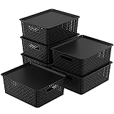 Hommp 6 Pack Plastic Storage Bins with Lids, Stackable Plastic Storage Baskets with Lids, Black
