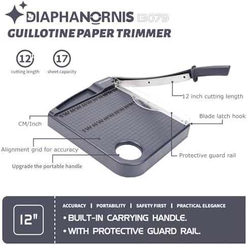 - Multifunctional Paper Trimmer: Designed with a safety guard, a safety latch, and anti-slip rubber pads, this professional paper cutter/trimmer can cut 12 sheets (20-16 lb) at a time safely for multiple purposes of use; a paperclip storage convenient for quick and hassle-free paper waste disposal or paperclip, binder clips, and small accessories storage