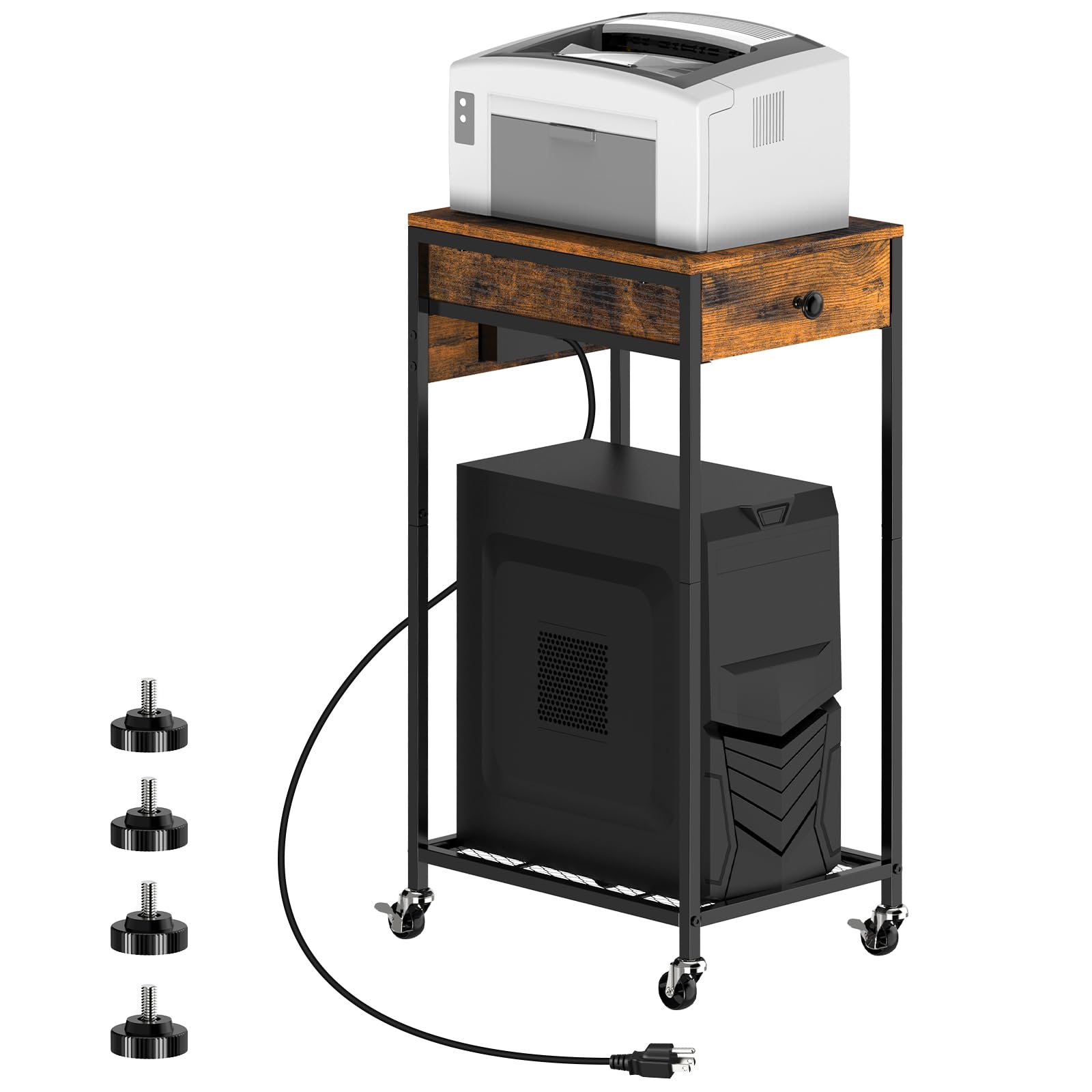 - PC Tower Stand with Charging Station: This mobile printer table comes with a charging station on the side, which can power your laptop, smartphone, printer, tablet, or any electronic device. Very suitable for maintaining an orderly workspace. In addition, the PC tower rack can also serve as a side table, providing additional power for your desk lamp.