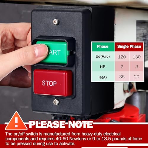 - [Standard Specifications]: Dual Voltage: 120V/230V; Single Phase Rated Current: 2HP/35 Amps at 120V; 3HP/20 Amps at 230V, comes with deep switch box hardware and screws for gang box installation (Please note: Single phase on/off switches made of heavy duty electrical components require 40-60 Newtons or 9 to 13.5 pounds of force to activate)