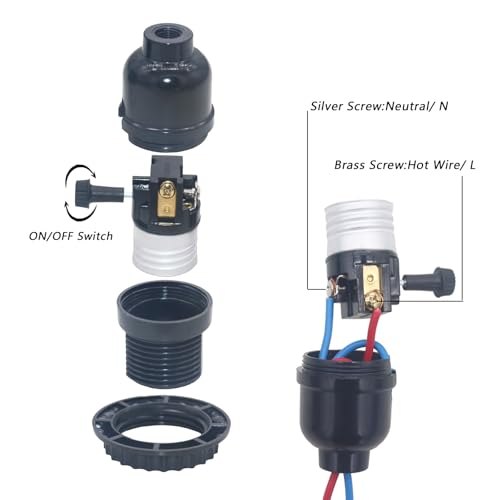 Odlamp E26 Lamp Socket: Threaded Lamp Socket Replacement With ON/Off Switch Medium Base Lamp repair kit with lamp Shade Ring For table lamp Pendant Light Bulb Fixture Floor Lamp High Temperature Resistant ,No Fire Hazard &Erosion-resistant,high-quality material This E26 lamp socket with switch is perfect for Table lamp, Floor lamp DIY Pendant Light Bulb Fixture Repair Kit, Maximum power rating: 250W Voltage : 12V-250V Current : 0- 4A The lamp parts comes with lamp shade ring and ON/Off switch, Easy to DIY or install, Package include: 5pcs 10 pcs e26 e27 E26 lamp sockets Install steps: 1.Thread the cord through the cap hole 2.Secure with a UL knot. 3.Connect the hot wire to the brass screw and tighten firmly. 4.Assemble the socket shell. 5.Screw in the light bulb.