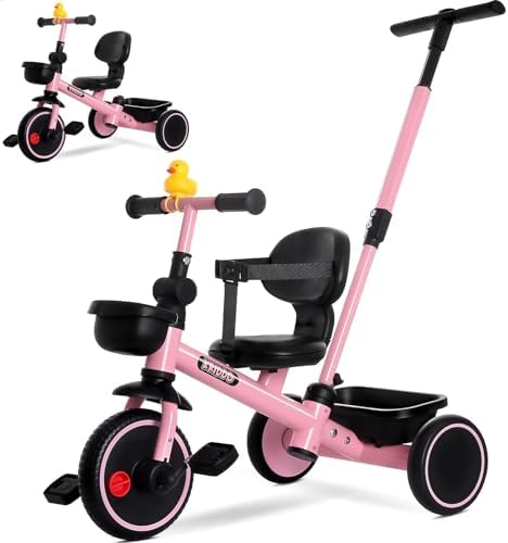 KRIDDO 2-in-1 Tricycle for Toddlers 1.5-5 Years, Push Tricycle with Parent Steering Detachable Handle, 9-Stage Adjustable Handlebar, Toddler Trike with Safety Belt, Clutch Pedals & Dual Basket, Pink