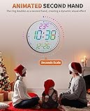 - 【Convert 12 Colors Freely】12" High definition LED large screen display, the digital wall clock can change 12 colors of large digits with remote control. You can read it clearly, even in the distance or corner. ATTENTION: Must be connected to a power source to work. Not battery operated. 【Design with Minimalist Fabric Elements】This stylish electronic wall clock exudes simplicity and sophistication, creating a serene ambiance perfect for both homes and offices.Combining aesthetics with functionality, this beautiful and practical clock serves as a perfect decorative accent for living rooms, bedrooms, kitchens, and offices, enhancing the charm of any newly decorated space. 【3-Level Auto-Brightness】Preset an ambient light sensor to automatically change its displaying brightness, make it comfortable for human eyes at any time. 【Memory Function】There is a built-in memory function, even if the power is disconnected, the time data will not be lost, no need to reset. And this large wall clock has a count-up or count-down function (up to 99 minutes and 99 seconds). 【Multi-Functional with Remote Control】Features 3 modes—count up/down timer, alarm clock, and regular clock. Easily switch modes with the mode button. Displays indoor temperature in ℃ or ℉, catering to various needs 【Animated Second Hand】The outer ring doubles as a second hand, creating a dynamic visual effect as it glides with the current time—adding a refined touch to your space.