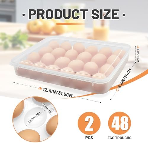 - Large Capacity Egg Tray: Each egg tray comes in a set of 2, designed to hold a total of 48 eggs. With dimensions of 12.4 x 9.2 x 2.2 inches, this egg holder features 24 troughs per tray, making it perfect for family gatherings or parties.