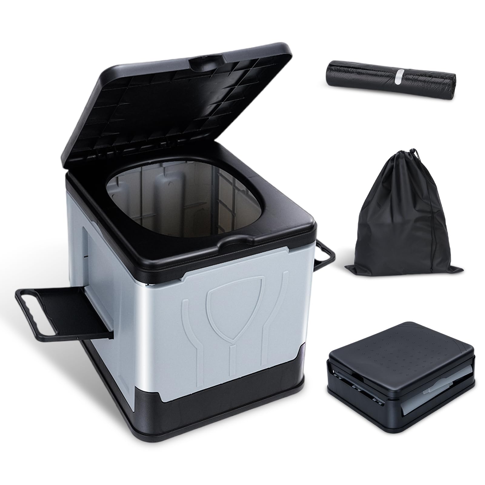- Space-Saving Portability:The portable toilet for camping can be folded into a size of 14.4"Lx12.4"Wx4.9"H in a storage bag and easily store under car seats or backpacks. The travel toilet does not take up space when you use, ideal for RV trips, festival camping, and hurricane preparedness kits