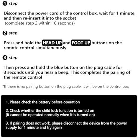 - Please Set Before Use. Step1) Make sure the batteries work fine. Replace them when needed. Step2) Plug the power cord to the power source. Ensure there is power to the source/outlet. Step3) Press and hold head lift and foot lift simultaneously, then press and hold the button on the cord of control box for 3 seconds until your hear 2 beeps sound, the remote is then paired.