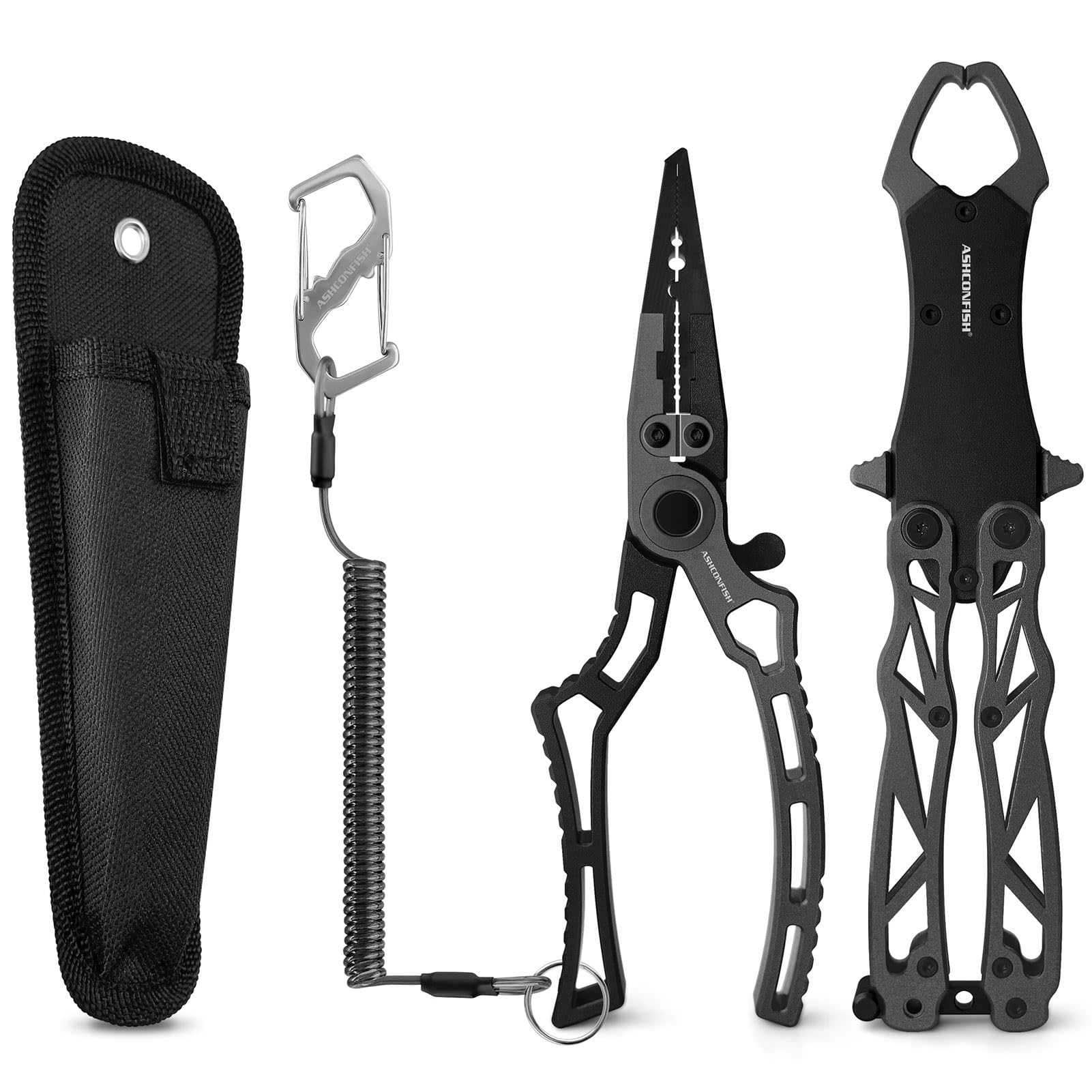 Ashconfish Fish Lip Gripper Pliers - Upgraded Muti-Function Aluminum Alloy Hook Remover and Split Ring Pliers for Fly Fishing, Ice Fishing, Fishing Gear (Black)