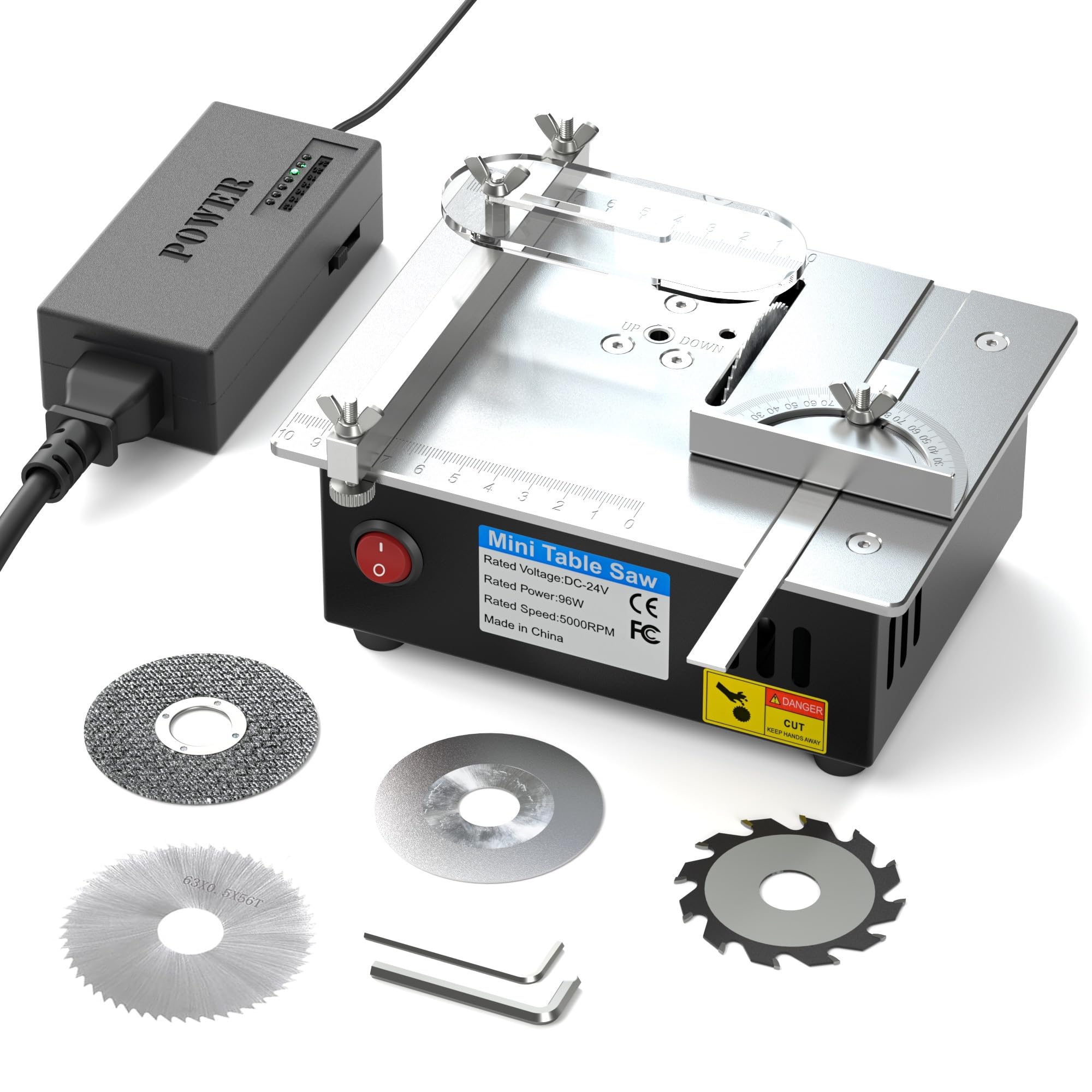 - 【MULTI-FUNCTION MINI TABLE SAW】The mini table saw combines cutting/grinding/carving/drilling in one. The craft mini table saw is equipped with 4 saw blades of different materials to easily cut balsa wood, veneer, PCB, plastic, etc. Table saws come with a drill chuck to which a grinding or polishing head is mounted; they can also be equipped with a flexible shaft for drilling holes or engraving objects.