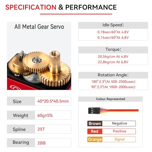 - Servo Motor High Torque: it reacts quickly and the maximum torque is up to 22.8kg·cm (316.63oz·in) at 6.8V.