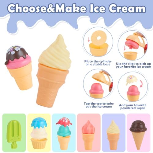 - 🤩 PREMIUM COLLECTION:Everything you need for an immersive ice cream cart experience! This luxury stroller is a children's ice cream house play game set, realistic ice cream models and cones, play money, a creative menu board, small scoops, and decorative pieces. Your very own mini ice cream shop—all in one box!