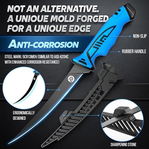 - Ultra-Sharp & Flexible 7" Fishing Knife - Expertly crafted from stainless steel with a fluoropolymer coating, this fishing knife delivers long-lasting sharpness, and excellent corrosion resistance. The non-slip rubber handle provides a firm, comfortable grip and secure control. The complete fishing gear set includes a ventilated sheath that not only promotes quick drying but also features a built-in sharpening stone, allowing you to maintain a perfect blade edge anytime, anywhere.