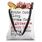 Funny design showing the full coder cycle from writing to debugging, with a twist “Nightmares About Code” in bold red. A perfect expression of dev humor and late-night stress loops. Ideal for computer programmers, coders, and software engineers who live the dream and the debug. Distressed font and high-contrast colors boost visual impact. Trending phrase for tech lovers. 16” x 16” bag with two 14” long and 1” wide black cotton webbing strap handles. Made of a lightweight, spun polyester canvas-like fabric. All seams and stress points are double-stitched for durability, and the reinforced bottom flattens to fit more items and hold larger objects. Spot clean/dry clean only.
