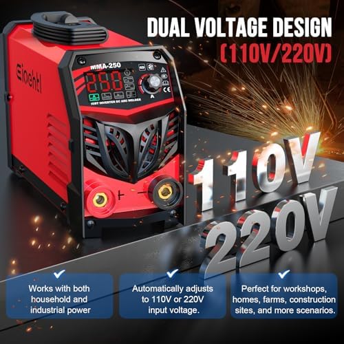 - 【DUAL VOLTAGE 110V/220V AUTO-SWITCHING】- This welder automatically detects and adapts to any standard 110V household outlet or 220V jobsite power source. Unleash ultimate portability for farm repairs, automotive projects, construction sites, and home workshops without voltage anxiety. (220V adapter sold separately)