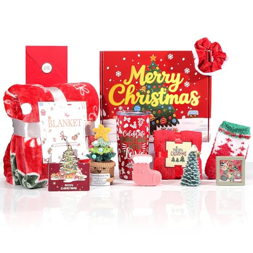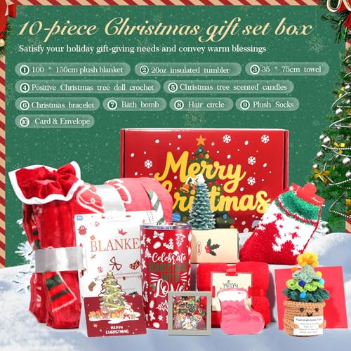 - 【Ultimate Christmas Gift Set for Women】This 10-piece premium Christmas gift box is the perfect holiday surprise for women, mom, wife, girlfriend, sister, teacher, or coworker. Includes a 20oz insulated tumbler, scented candle, cozy fleece throw, bath salt bomb, festive bracelet, crochet ornament, socks, greeting card with the words "Merry Christmas , and more—all elegantly packaged for spreading seasonal joy.