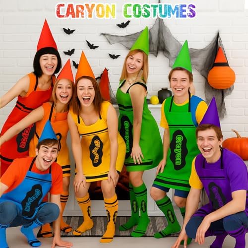 Jecery 6 Set Halloween Crayon Costume Adult Color Crayon Aprons Gnome Cone Hats Neon Striped Socks Halloween Group Family Costumes for Adults Fancy Dress up Outfit Birthday Party Cosplay