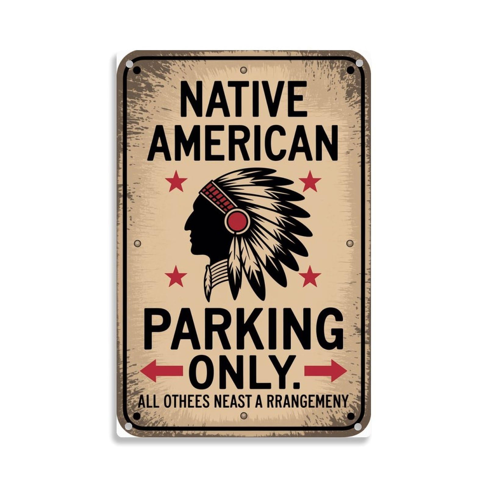 Add a touch of rustic charm and humor to your space with this vintage-style Native American parking sign. Measuring 7.9 x 11.9 inches (20 x 30 cm), this metal tin sign features a classic design with a weathered finish, showcasing a traditional headdress silhouette in black and red accents against a cream background. The sign comes pre-drilled for easy mounting and is both waterproof and weather-resistant, making it suitable for both indoor and outdoor display. Perfect for decorating your home, bedroom, kitchen, bar, dorm, or bathroom, this decorative piece combines historical imagery with playful text that reads 'Native American Parking Only, All Others Need a Reservation.' The distressed edges and vintage aesthetic give it an authentic, aged appearance that adds character to any wall. Built to last, this durable metal sign makes a unique conversation starter and adds personality to your space while maintaining its quality appearance over time.
