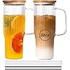 40 oz Ribbed Glass Tumbler with Handle, 2 Pack Glass Cups with Lids and Straws, Large Iced Coffee Cup,Borosilicate, with Bamboo Lid and 4 Straws
