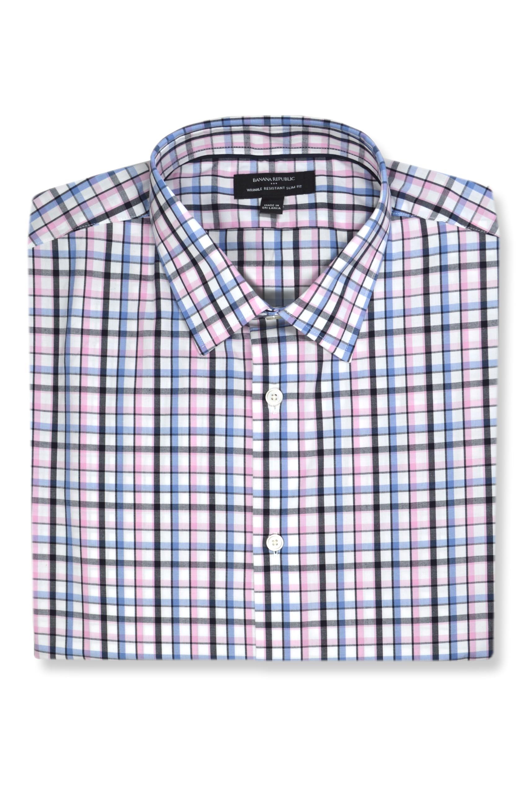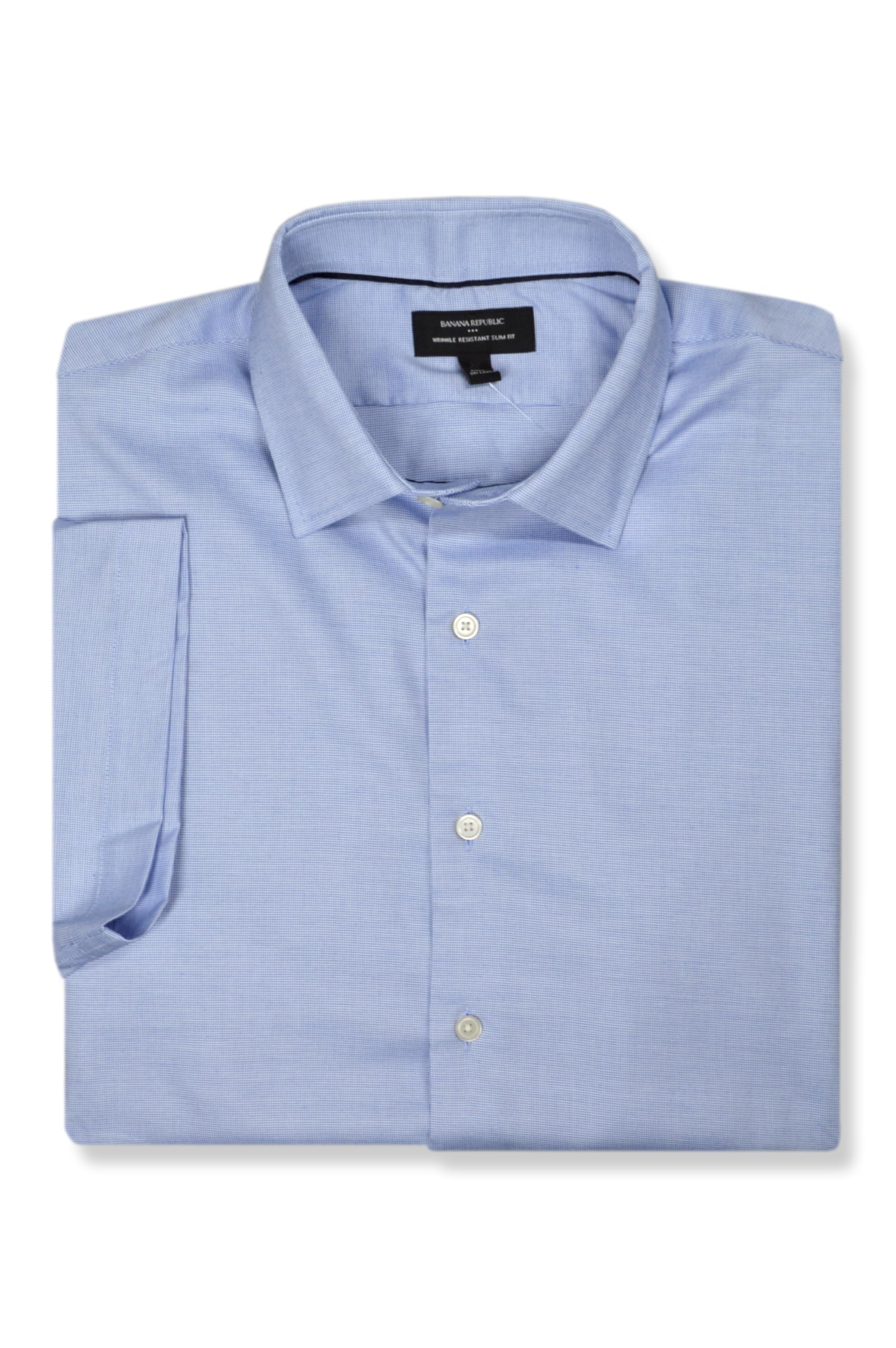 Banana Republic Mens 452800 Slim Fit Short Sleeve Button Down Shirt, Chambray Blue Stripe (X-Large)