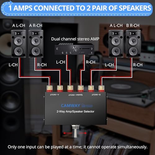 - Plug-and-Play ---: Requires no external power supply, just switch simplely by A/B/OFF button, CAMWAY 2-way amplifier speaker switcher specifically designed for who with multiple audio sources, stop letting your amp/speaker collect dust in the garage