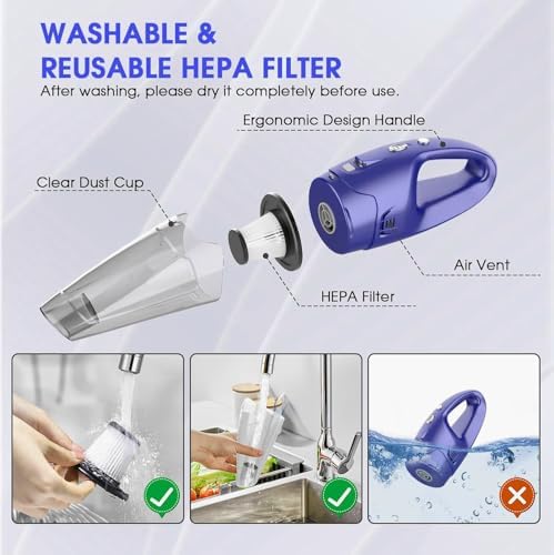 - Washable Filter & Mini Size:The enhanced HEPA filters are washable and reusable, ensures cordless hand vacuum cordless rechargeable efficient suction while keeping dust and dirt out to prevent clogging, thus protecting the durability of the motor. The small size makes them easy to store at home and in the car.