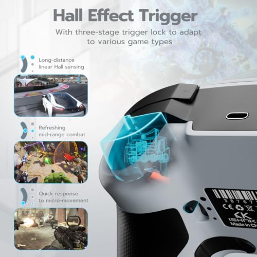 ISHAKO Wireless PC Controller – Gaming Controller with Hall Effect Joysticks, 3-Stage Hall Triggers, 1200mAh Battery, 1000Hz Polling, 4 Back Buttons, RGB Lighting, 1200mAh Battery – Works with Windows, Mac, Steam, Luna, Tesla, iOS, Android, Switch- White
