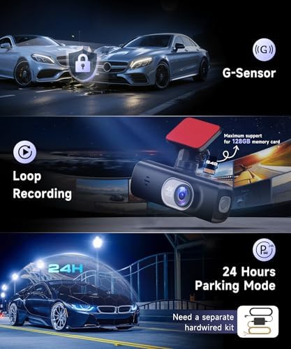 - 【Car Cameras 24 Hours Parking Mode】Leave your vehicle parked and powered off—this dashcam shifts automatically into parking mode, delivering round-the-clock monitoring. Important: Parking surveillance requires a separately purchased hardwire kit