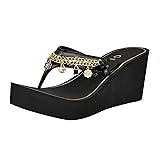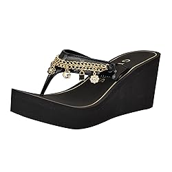 Add some sparkle and shine to your footwar with the Sutton EVA sandal from GUESS. With fun charms and chain detailing you will surely be stepping out in style! Est. 1981, Guess is a global lifestyle brand and a symbol of a young, adventurous lifestyle. Toe/Closure/Sole Type: Open/Round Toe ; Slip-on Closure ; Man Made Sole Materials: Faux Patent Leather Upper Platform Height: 2.95" platform